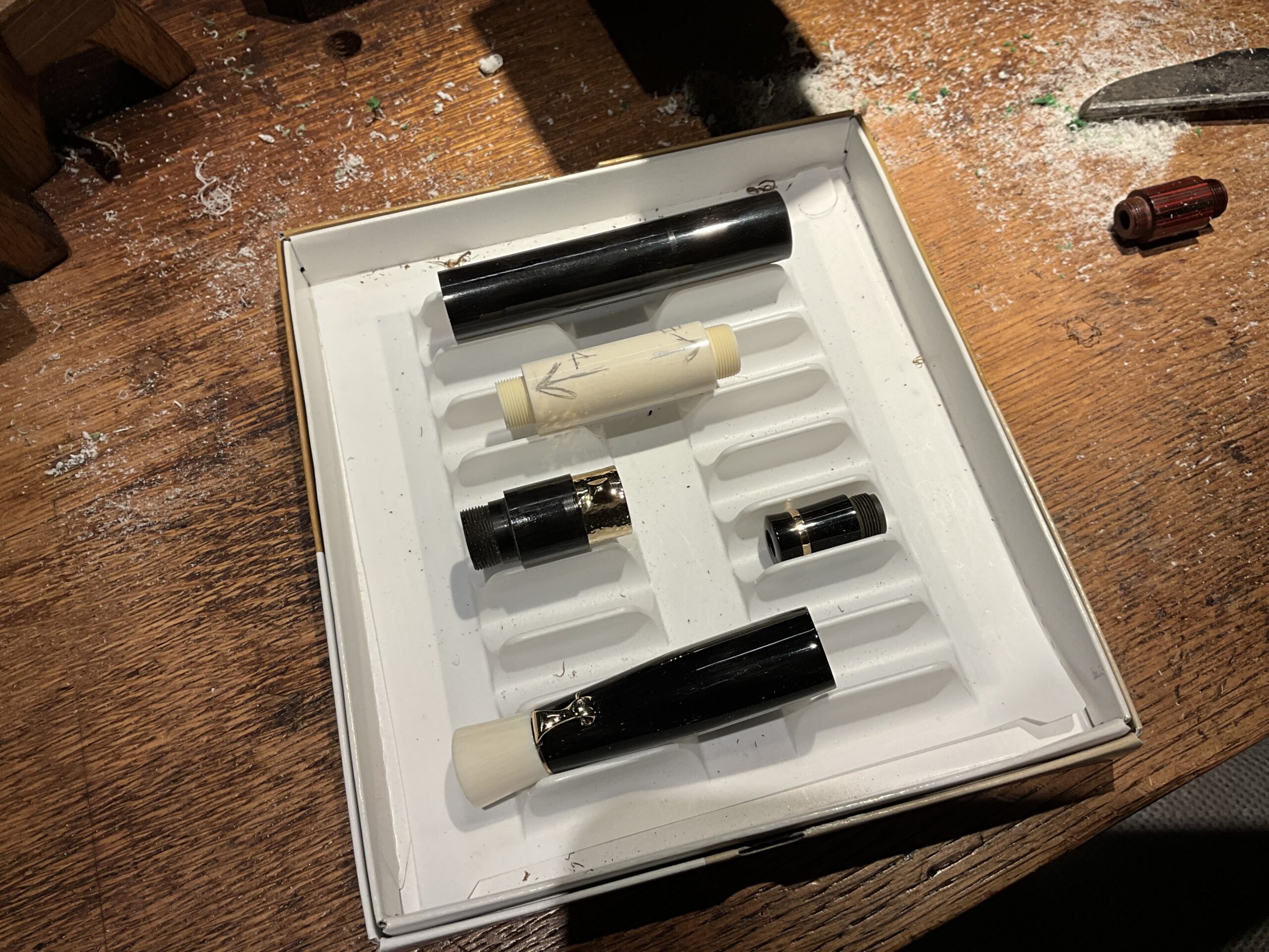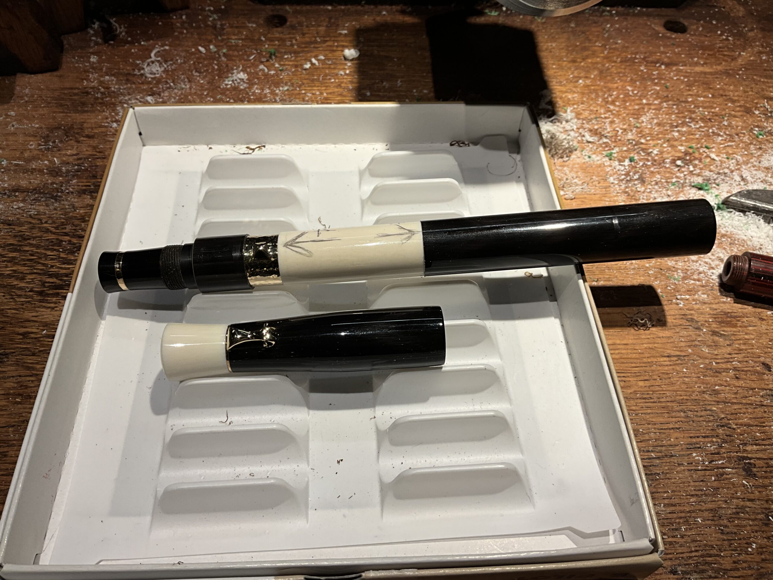 黒エボナイトをベースに、摺漆数回、黒漆数回、梨地金K24を9割・梨地銀950を1割の比率で蒔き、梨地漆数回、研ぎ、摺漆数回、磨き、の順に仕上げまます。